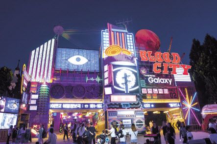 ‘블러드시티’는 에버랜드의 가을 축제를 대표하는 거대한 야외 테마존이다. 매년 가을마다 새로운 스토리와 이색 콜라보를 선보이며 공포체험 성지로 자리매김해 왔다. 지난해에는 ‘오징어게임’으로 방송계의 아카데미로 불리는 미국 에미상을 수상했던 채경선 미술감독과 함께 사이버펑크풍의 이색 체험 공간을 조성했다.