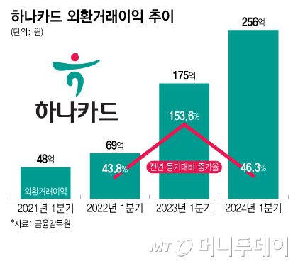 6일 금융감독원 금융통계정보시스템에 따르면 올해 1분기 하나카드의 외환거래이익은 256억원으로 나타났다. 외환거래이익은 국내 카드회원이 해외가맹점에서 결제하거나 해외 여행객이 국내가맹점에서 결제할 때 발생하는 외환거래를 통해 얻는 이익 등을 말한다. 해외가맹점 결제액이 늘어날수록 외환거래이익도 증가한다. 하나카드의 1분기 외환거래이익은 2021년 48억원이었으나 △2022년 69억원 △2023년 175억원으로 매해 가파르게 성장했다.