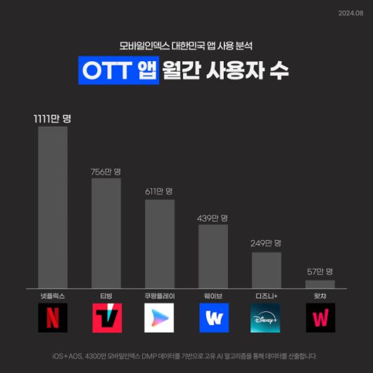 넷플릭스의 월간 활성화 이용자는 1111만 명으로 전월(1096만명) 대비 15만 명 증가했다. 웨이브의 월간 이용자 수는 439만 명으로 전월 대비 7만 명 가량 늘었다.