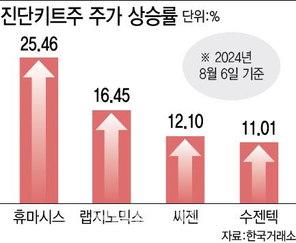 6일 엠피닥터에 따르면 휴마시스(205470)는 전 거래일 대비 25.46% 오른 2050원에 거래를 마쳤다. 랩지노믹스(084650)도 16%대 오른 3080원에 장을 마감했고 씨젠(096530)(12.10%), 수젠텍(253840)(11.01%) 등도 동반 강세를 보이며 상승 마감했다.