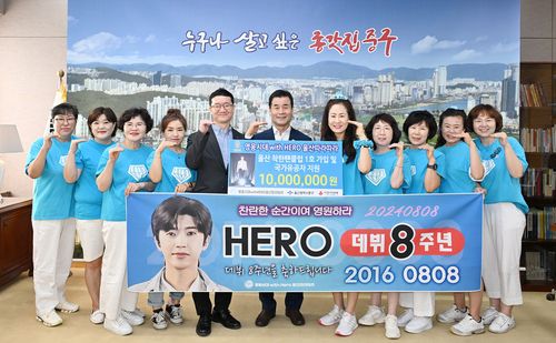 (울산=연합뉴스) 김근주 기자 = 울산시 중구는 가수 임영웅 팬클럽 '영웅시대 With Hero 울산 따라따라'가 임영웅 데뷔 8주년과 광복절 79주년을 기념해 이웃돕기 성금 1천만원을 기부했다고 7일 밝혔다.