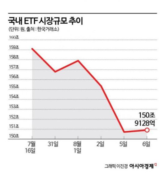 8일 한국거래소에 따르면 이달 6일 기준 국내 ETF 순자산총액은 150조9128억원이다. 지난달 말 대비 3.75% 감소다. 특히 지난달 16일 159조1017억원까지 증가했으나 최근 주식시장 불안에 규모가 축소하는 모양새다.