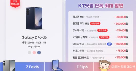 또, KT닷컴에서 제품을 구매할 경우, Z 폴드6 1TB 용량을 512GB 가격에, Z 플립6 512GB 용량을 256GB 가격에 제공하는 용량 업그레이드 혜택을 제공한다. 선착순 1000명에게는 단말케어 프로그램인 '삼성케어플러스 1년권'을 제공한다.