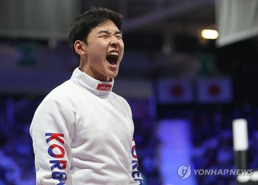 8일(현지시간) 프랑스 파리 노스 파리 아레나에서 열린 근대5종 남자 펜싱 랭킹라운드에 출전한 전웅태가 이집트 선수와의 대결에서 득점한 뒤 환호하고 있다. / 사진 = 연합뉴스 |