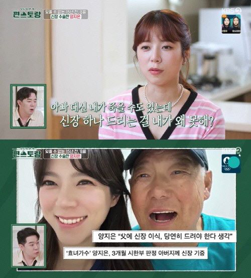 양지은은 지난 2010년 아버지가 당뇨 합병증으로 시한부 선고를 받자 자신의 신장을 이식한 바 있다. 그는 2021년 방영된 TV조선 ‘미스트롯2’ 출연 당시 과거 판소리를 했지만 아버지에게 왼쪽 신장을 이식한 후, 수술 후유증으로 노래를 한때 포기하기도 했다.