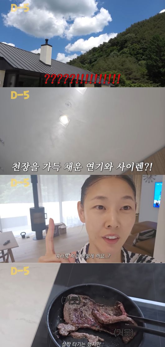시끄러운 사이렌 소리와 천장까지 가득 채운 집의 모습에 한혜진은 "여러분 저거 어떻게 끄냐, 큰일났다. 소고기가 먹고 싶었을 뿐이고 단지 팬의 온도가 높았을 뿐이다. 고기 끝이 살짝 타기는 했다"고 상황을 전했다.