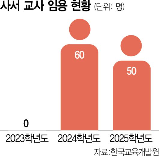학교도서관진흥법령에 따라 학교도서관 한 곳당 1명 이상의 전문 인력(사서교사·사서)을 둬야 한다. 그러나 한국교육개발원에 따르면 지난해 기준 전국 초중고 학교도서관 1만 1792곳 가운데 전문 인력이 배치된 곳은 4568곳(약 38.74%)에 불과하다. 비정규직인 교육공무직을 제외하고 수업 지도를 할 수 있는 사서교사의 배치 비율은 2978곳(25.25%)에 그쳤다. 사서 교사 임용 수는 2023학년도 0명, 2024학년도 60명, 2025학년도 50명에 머물고 있다. 전국 초중고의 98%가 학내에 도서관을 설치해 매년 총 1796억 원가량의 예산을 투입하는데도 학생들에게 책을 빌려주는 것 외에는 별다른 기능 없이 사실상 방치된 채 운영되고 있는 셈이다.