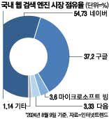 구글의 점유율은 지난달 점유율 36.24%에서 이달 9일 기준 0.96%포인트 상승했으며, MS 빙은 3.55%에서 3.6%로 0.5%포인트 늘었다. 반면 네이버는 55.58%에서 54.73%로 0.85%포인트 줄었다.