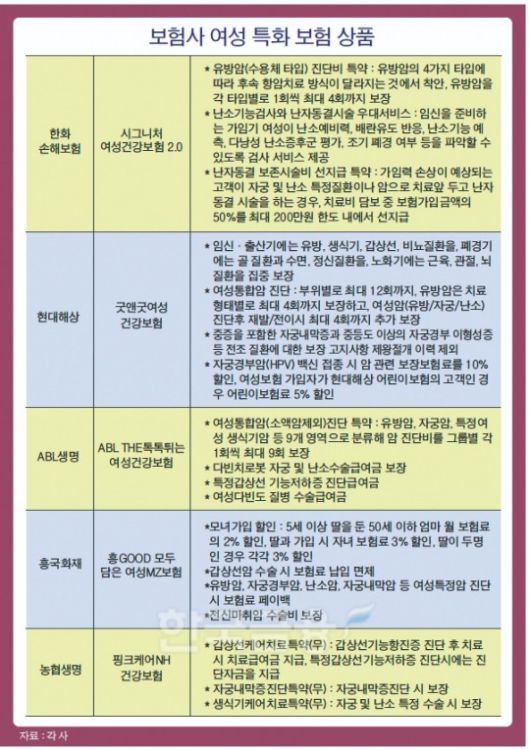 11일 보험업계에 따르면, 한화손보를 시작으로 ABL생명, 흥국화재, 신한라이프 등 다양한 보험사들이 여성 특화 보험을 출시했다. 여성 특화보험은 여성에게 많이 발생하는 질환인 유방암, 자궁암, 난소암 관련 보장이 꼼꼼히 되어 있다. 유방암은 우리나라 여성에게 가장 많이 발병하는 암이지만 조기에 발견하면 10년 생존율이 85%로 완치가 가능하다. 조기발견 시 완치율도 높지만 10명 중 2명이 재발해 전이암으로 번진다.
