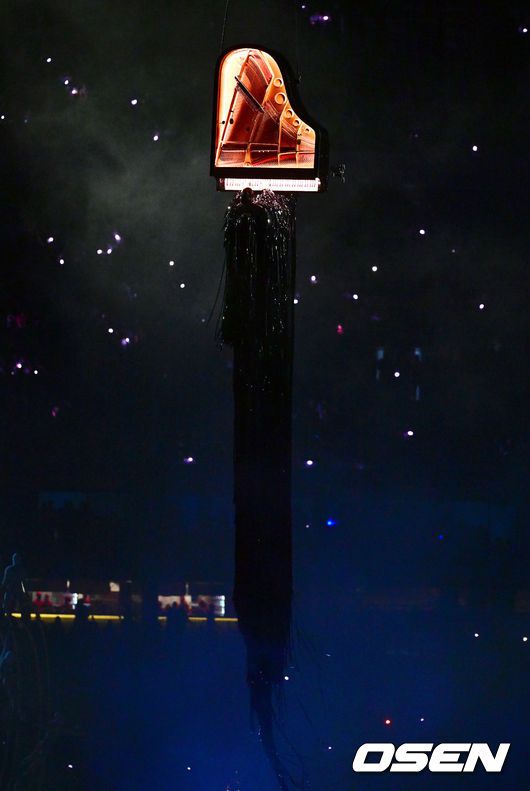 폐회식에서 수직으로 매달린 피아노를 연주하고 있다. 2024.08.12 / dreamer@osen.co,kr