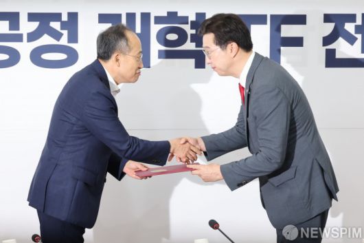 [서울=뉴스핌] 이형석 기자 = 추경호 국민의힘 원내대표가 12일 오전 서울 여의도 국회에서 열린 ‘포털 불공정 개혁 TF’ 임명장 수여식 및 1차 회의에서 강민국 위원장에게 임명장을 수여하고 있다. 2024.08.12 leehs@newspim.com