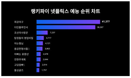 순위 키워드 8월 1주차 7월 5주차 증감 비율 1 최강야구 41,377 33,610 7,767 23.1% 2 더인플루언서 38,267 2,616 35,651 1362.8% 3 조선의사랑꾼 7,237 5,344 1,893 35.4% 4 탐정들의 영업비밀 4,717 4,526 191 4.2% 5 아는형님 4,121 5,351 -1,230 -23.0% 6 용감한형사들3 3,863 4,158 -295 -7.1% 7 아빠는 꽃중년 2,678 2,648 30 1.1% 8 전현무계획 2,644 3,188 -544 -17.1% 9 고딩엄빠5 2,014 1,863 151 8.1% 10 돌싱글즈 1,757 2,235 -478 -21.4% 넷플릭스 예능 트렌드 지수 분석 결과 ⓒ랭키파이