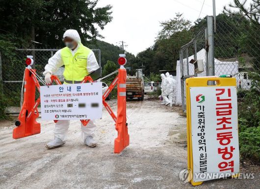 강원 화천군의 한 양돈농가에서 아프리카돼지열병(ASF)이 발생해 방역 당국 관계자가 입구를 통제하고 있다. |