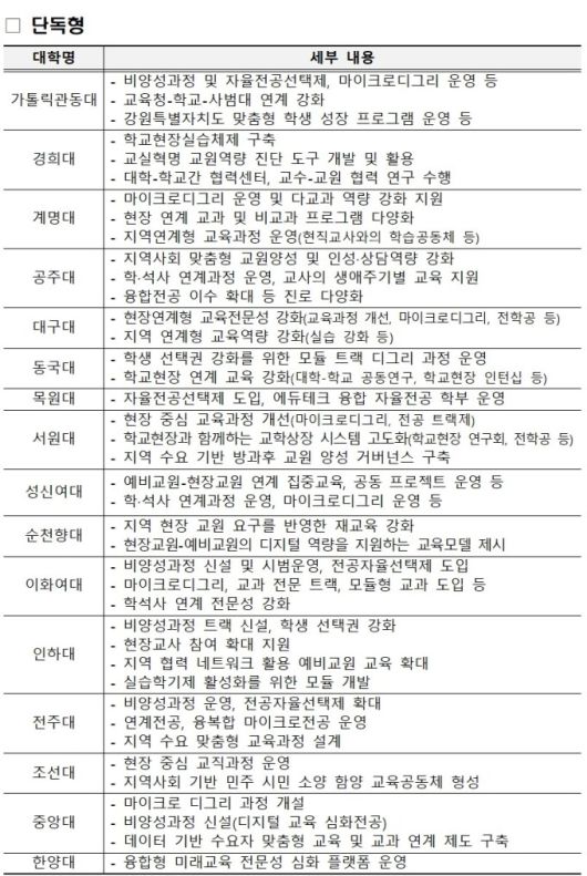 구체적으로 AI 디지털교과서 활용 교육 교과목 개설 및 수업 모델 개발 등 제시, 교실 혁명 선도 교사 등 전문가를 활용한 워크숍과 실습 연수 등 비교과 프로그램 운영, 사범대 모집 정원 일부를 자유전공 학부 전원으로 포함해 에듀테크 등 교육 전문가를 양성하는 비(非) 교원 양성과정 운영, 국제 바칼로레아(IB), 늘봄학교 등 지역사회의 수요를 반영한 교원 양성 과정 개선 등이다.