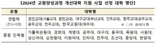 교육부와 한국연구재단은 2024년 '교원양성 과정 개선 대학 지원 사업' 선정 평가 결과 교대·사범대 연합체(컨소시엄) 유형으로 4곳, 중등 교원양성기관 단독형에 16곳을 각각 선정했다고 13일 밝혔다.