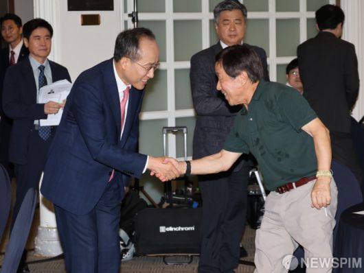 [서울=뉴스핌] 양윤모 기자 = 추경호 국민의힘 원내대표가 13일 오전 서울 중구 한국프레스센터 내셔널프레스클럽에서 개최된 관훈클럽 초청 토론회에 참석하며 악수하고 있다. 2024.08.13 yym58@newspim.com