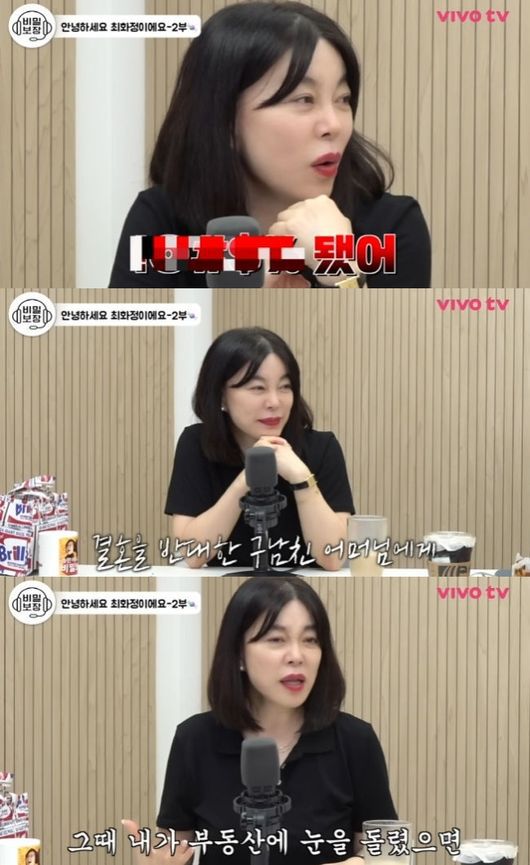 지난 7월 18일 '비보티비'에 출연한 최화정은 김숙, 송은이 등과 연애 및 결혼 등에 대해 다양한 이야기를 나눴고, 한국 사회의 결혼 강요 문화도 꼬집었다.