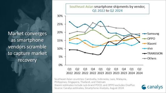 동남아 시장에서 7분기 연속 출하량이 감소하던 삼성전자는 2·4분기에는 분위기 전환에 성공하면서 시장 점유율 18%로 선두 자리를 지켰다. 오포와 샤오미가 17%로 삼성전자 턱 밑까지 쫓아왔고 비보와 트랜션이 14%를 보였다.