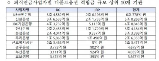 사업자 별 디폴트옵션 적립금 규모 상위 10개 기관은 KB국민은행, 신한은행, IBK기업은행, 하나은행, 농협은행, 우리은행, 근로복지공단, 광주은행, 부산은행, 교보생명 순으로, 은행이 대부분이었다.