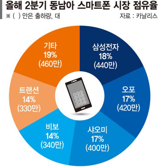 동남아 시장에서 7분기 연속 출하량이 감소하던 삼성전자는 2·4분기에는 분위기 전환에 성공하면서 시장 점유율 18%로 선두 자리를 지켰다. 오포와 샤오미가 17%로 삼성전자 턱 밑까지 쫓아왔고 비보와 트랜션이 14%를 보였다.