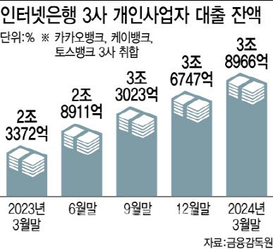 13일 금융감독원 금융통계정보시스템에 따르면 올해 1분기 기준 케이뱅크·카카오뱅크·토스뱅크 등 인터넷은행 3사의 개인사업자 대출 잔액은 3조 8966억원으로 집계됐다. 이는 지난해 같은 기간보다(2조 3373억원) 66.7%(1조 5593억원) 늘어난 액수다.