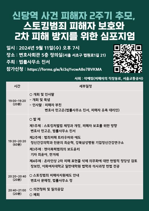 법률사무소 진서와 피해자 유족은 내달 11일 오후 7시 서울 서초구 변호사회관 5층에서 '스토킹범죄 피해자 보호와 2차 피해 방지를 위한 심포지엄'을 개최한다고 14일 밝혔다.