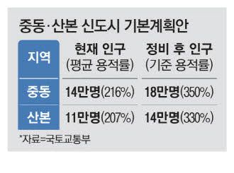군포시는 산본의 기준 용적률을 이보다 조금 낮은 330%로 제시했다. 현재 평균 용적률이 207%로 부천시 중동보다 낮기 때문에 이 같은 수준에서 결정된 것으로 보인다. 이에 따라 산본 내 주택은 4만2000가구(인구 11만명)에서 5만8000가구(인구 14만명)로 1만6000가구 늘어날 전망이다.