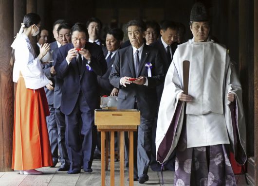 지난해 8월 15일 '다함께 야스쿠니 신사를 참배하는 국회의원 모임' 의원들이 야스쿠니 신사를 방문하고 있다. 뉴시스 |