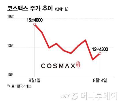 14일 코스피 시장에서 코스맥스는 전일 대비 6600원(5.61%) 오른 12만4300원에 거래를 마쳤다. 이날 4%대 상승 마감했지만 전일(13일) 코스맥스 주가는 14.59% 급락 마감하며 하루 만에 시가총액 약 2281억원이 증발했다. 이달 들어서는 주가가 19%대 빠진 상태다.