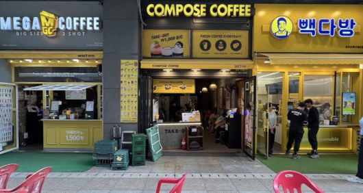 서울 종로구의 한 건물 1층에 있는 저가 커피 프랜차이즈 매장들. 왼쪽부터 메가커피, 컴포즈커피, 빽다방. /김남희 기자 |