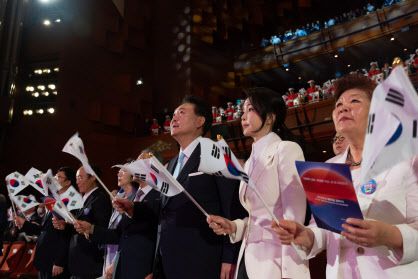윤석열 대통령과 김건희 여사가 15일 서울 종로구 세종문화회관에서 열린 제79주년 광복절 경축식에서 태극기를 흔들고 있다(사진=연합뉴스) |