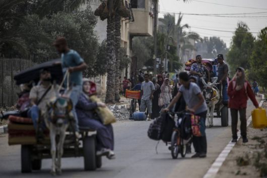 팔레스타인 가자지구 중부의 데이르 알 발라 인근에서 16일(현지시간) 현지 피난민들이 소지품을 챙겨 이동하고 있다. 사진=EPA연합뉴스 |