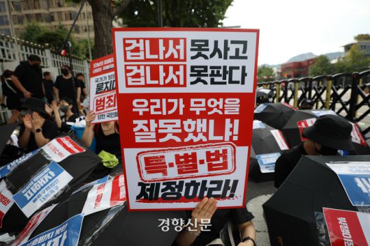 ‘티메프 사태’ 피해자들이 18일 서울 종로구 정부서울청사 앞에서 열린 검은우산 집회에서 피해자 구제를 촉구하는 손팻말을 들고 있다. 이날 참가자들은 정부에 실효성 있는 구제방안 마련과 특별법 제정을 촉구했다. 권도현 기자 |