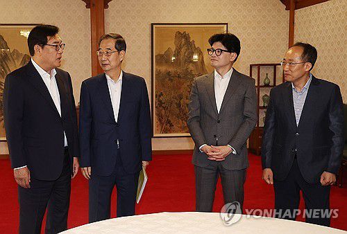 (서울=연합뉴스) 김성민 기자 = 18일 오후 서울 종로구 삼청동 총리공관에서 열린 고위당정협의회에서 참석자들이 환담을 나누고 있다. 왼쪽부터 정진석 대통령 비서실장, 한덕수 국무총리, 국민의힘 한동훈 대표, 추경호 원내대표. 2024.8.18
