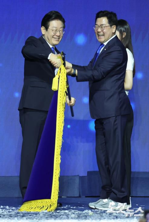 18일 서울 송파구 올림픽공원 KSPO돔에서 열린 더불어민주당 제1차 정기전국당원대회에서 이재명 신임 대표가 박찬대 원내대표로 부터 당기를 전달받고 있다.