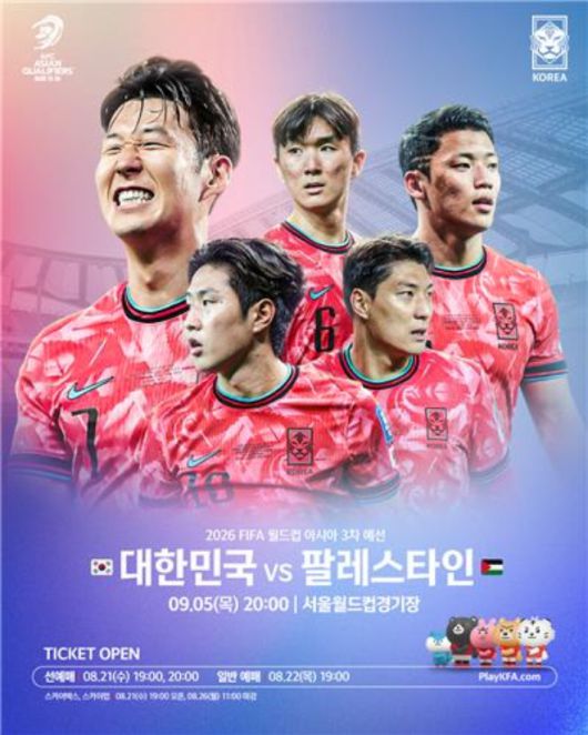 대한축구협회는 내달 5일 오후 8시 서울월드컵경기장에서 열리는 팔레스타인과의 2026 국제축구연맹(FIFA) 북중미 월드컵 아시아 지역 3차 예선 입장권을 21일부터 판매한다고 19일 밝혔다.