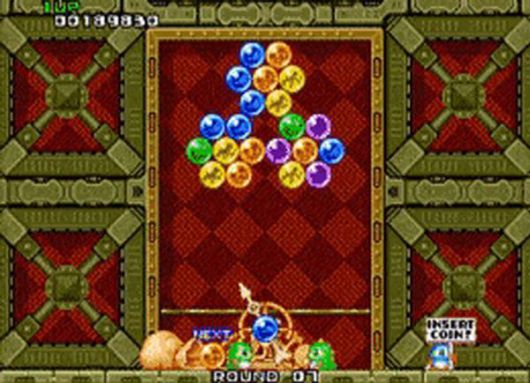 검떠: '퍼즐 보블'은 타이토에서 1994년도에 출시한 아케이드 게임으로, 오락실 최고의 히트작 중 하나였던 '버블 보블'의 귀여운 공룡들이 퍼즐 세계로 들어간 게임입니다! 귀요미 공룡들이 나와서 풍선을 터뜨리는 아기기한 게임이며, 한번 빠지면 시간 가는 줄 모를만큼 재미있죠.