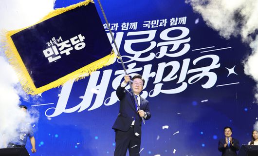 연임에 성공한 이재명 더불어민주당 대표가 18일 서울 송파구 올림픽공원 KSPO돔에서 열린 제1차 전국당원대회에서 당기를 흔들고 있다. 공동취재 |