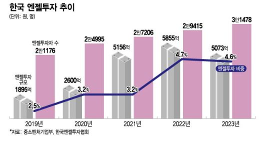 국내 엔젤투자 역시 지난해 한풀 꺾이긴 했지만 꾸준한 성장세다. 국내 개인투자조합 투자건수(투자금액)는 2019년 929개(1901억원)에서 2023년 1909개(5073억원)로 늘었다. 2018년 엔젤투자 완전 소득공제 기준을 1500만원에서 3000만원으로 대폭 높인 게 주효했다.