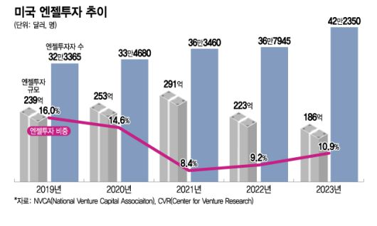 19일 NVCA(미국 벤처캐피탈협회)에 따르면 2023년 미국의 벤처투자 규모는 총 1706억달러로 전년대비 29.6% 급감했다. 길어지는 글로벌 고금리 기조에 벤처투자 혹한기가 지속되면서 위축됐다. 엔젤투자도 예외는 아니었다. 그러나 감소폭은 훨씬 적었다. 미국 뉴햄프셔대학이 발간하는 CVR(Center for Venture Research) 보고서에 따르면 2023년 미국 엔젤투자 규모는 186억달러다. 전년 대비 16.4% 감소하는데 그쳤다. 초기 스타트업의 든든한 자금줄 역할을 하고 있다.