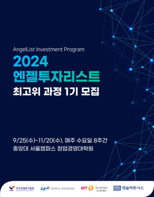 머니투데이 스타트업 전문 미디어 유니콘팩토리는 국내 엔젤투자 활성화와 전문성 강화를 위해 중앙대학교 창업경영대학원, 액셀러레이터(AC)이자 팁스(TIPS) 운용사인 엔슬파트너스와 함께 '엔젤리스트 최고위 과정'을 진행한다. 내달 8일까지 참여 접수를 받고 있다.