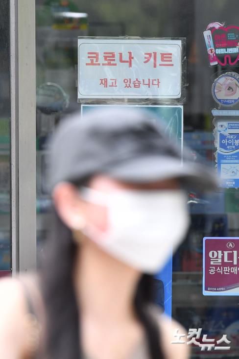 코로나19가 재유행하고 있는 가운데 20일 서울 시내의 한 약국에 '코로나 키트 재고 있습니다' 문구가 적힌 안내문이 붙어 있다.