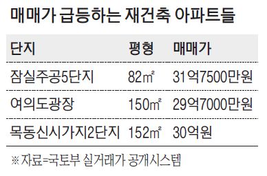 올해 아파트 매매 시장은 “얼어 죽어도 신축”을 고수하는 이른바 ‘얼죽신’ 열풍이 뚜렷하지만 최근엔 구축 대표주자인 재건축 아파트 거래도 심상치 않다. 특히 토지거래허가구역인 잠실동·여의도동·목동 에서조차 단번에 1억원씩 뛰는 매매가 이뤄지고 있다. 업계에선 재건축 등 도심정비사업을 통한 주택 공급이 이달 정부가 발표한 8·8대책의 핵심이다보니 재건축 단지 분위기가 달라질지 예의주시하고 있다.