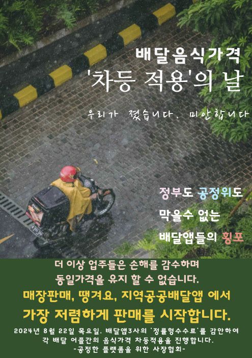 21일 관련 업계에 따르면 공정한 플랫폼을 위한 사장 협회(공사협)는 22일 ‘배달음식가격 차등 적용의 날’을 추진한다. 배달앱의 불공정행위와 정률형 상품 확대에 따른 대응 차원이다. 배달앱에 따라 3개 등급을 나눠 가격 인상 폭을 정해주는 가이드라인도 함께 공유했다. 최대 9.8%의 가격을 올려 받는 구조인데 이는 배달의민족(배민), 쿠팡이츠 등의 정률제 수수료율과 같다.