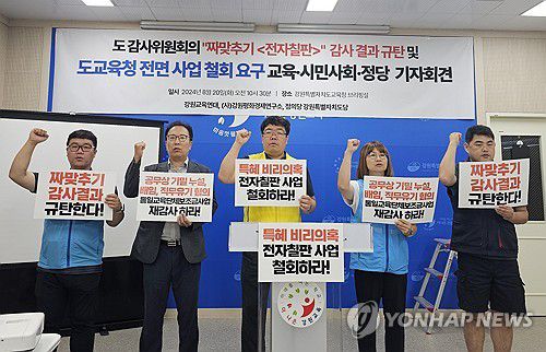 (춘천=연합뉴스) 양지웅 기자 = 강원특별자치도교육청을 둘러싼 여러 의혹에 관해 도 감사위원회가 최근 발표한 감사 결과를 두고 지역 사회·교원단체와 진보정당이 "짜맞추기식 감사"라고 비판하며 사업 철회를 요구하고 나섰다.