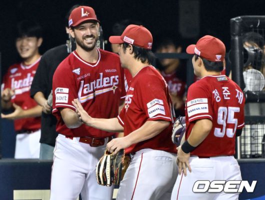 [OSEN=잠실, 조은정 기자]20일 서울 송파구 잠실야구장에서 ‘2024 신한 SOL Bank KBO리그’ LG 트윈스와 SSG 랜더스의 경기가 열렸다. 이날 LG는 에르난데스를 SSG는 앤더슨을 선발 투수로 내세웠다. 3회말 무사 1,3루 SSG 선발 앤더슨이 LG 문보경의 병살타에 이은 신민재의 홈 태그아웃으로 삼중살이 되자 기뻐하고 있다. 2024.08.20 /cej@osen.co.kr