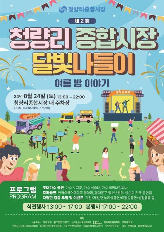 서울 동대문구(구청장 이필형)는 오는 24일 오후 1시부터 10시까지 청량리종합시장상인회가 주최하는 제2회 ‘청량리종합시장 달빛나들이’ 축제가 열린다고 밝혔다.