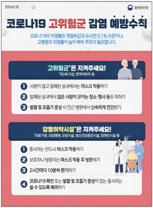 이에 따라 질병청은 감염 취약시설 관리 및 의료 대응 강화, 코로나19 감염예방 수칙 마련, 코로나19 치료제·진단키트 수급, 2024~2025절기 예방접종 등을 통해 이번 유행에 대응하기로 했다.