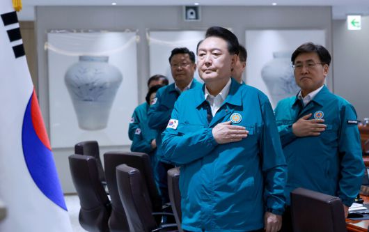 윤석열 대통령이 지난 19일 서울 용산 대통령실 청사에서 열린 을지 및 제36회 국무회의에서 국기에 경례를 하고 있다. 연합뉴스 |