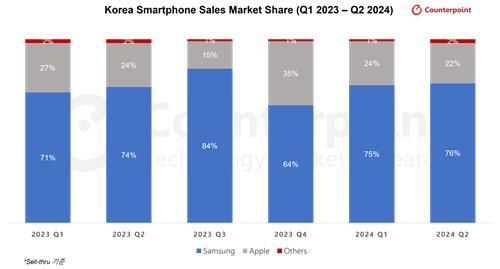 지난해 4분기 35%를 기록했던 애플의 점유율은 올해 1분기 24%로 급락했다가 2분기 다시 22%로 낮아졌다.